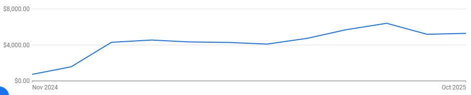 By month two, spending had doubled to almost $1,600. In Month 3, the amount spent was $4,300. It stayed in the $4k range each month for 6 months. When Performance Max ads started up, it immediately increased to almost $6,000. Four months later, it has remained in the $5k-$6k range. And it continues to grow as new campaigns, ad groups, and ideas are built out.
